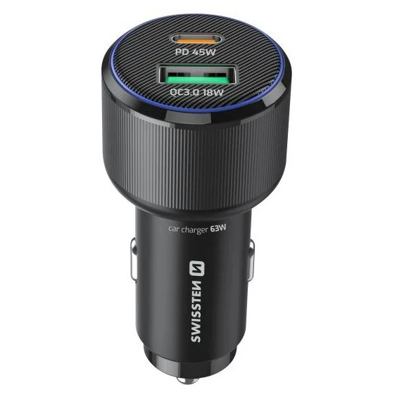 Swissten Autoladegerät mit PD 3.0 und QC 3.0 Unterstützung bietet hohe Leistung bis zu 63W und ist ideal zum Laden von Laptops, Tablets und Smartphones. Dank des USB-C-Anschlusses mit bis zu 45W können auch anspruchsvolle Geräte problemlos mit Strom versorgt werden, während der USB-A-Anschluss schnelles Laden mit bis zu 18W bietet.