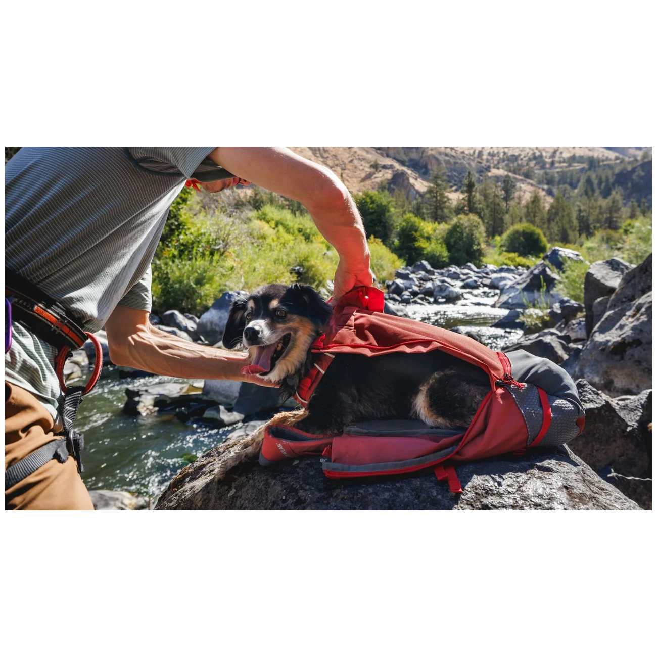 Mit dem Ruffwear Hitch Hiker™ Dog Backpack Carrier können Sie mit ihrem vierbeinigen Freund ohne Einschränkungen reisen. Dank ihm bewältigen Sie sicher technische Bergabschnitte oder radeln über Asphaltstrecken.