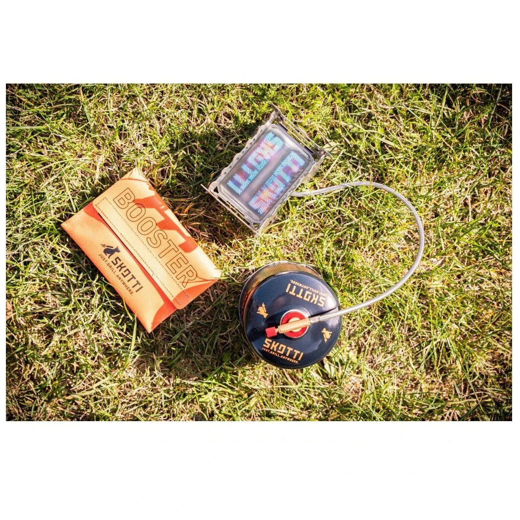 Der SKOTTI Booster ist mit allen gängigen Schraubkartuschen EN 417 kompatibel und funktioniert mit den meisten gängigen Kochutensilien, sei es Pfannen oder kleinere Töpfe. Er passt auch hervorragend zum Grill SKOTTI Mini, der in einen sauberen und leistungsstarken Gasgrill verwandelt werden kann. Diese Kombination beschleunigt die Zubereitung von Speisen erheblich und vereinfacht das Kochen dort, wo nicht genügend Platz oder Zeit zum Feuermachen vorhanden ist.