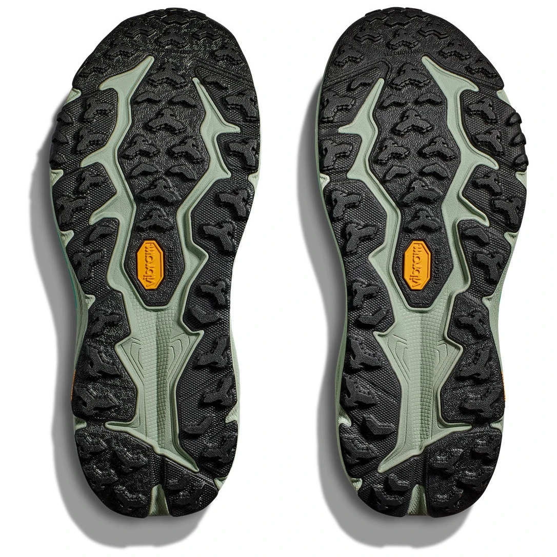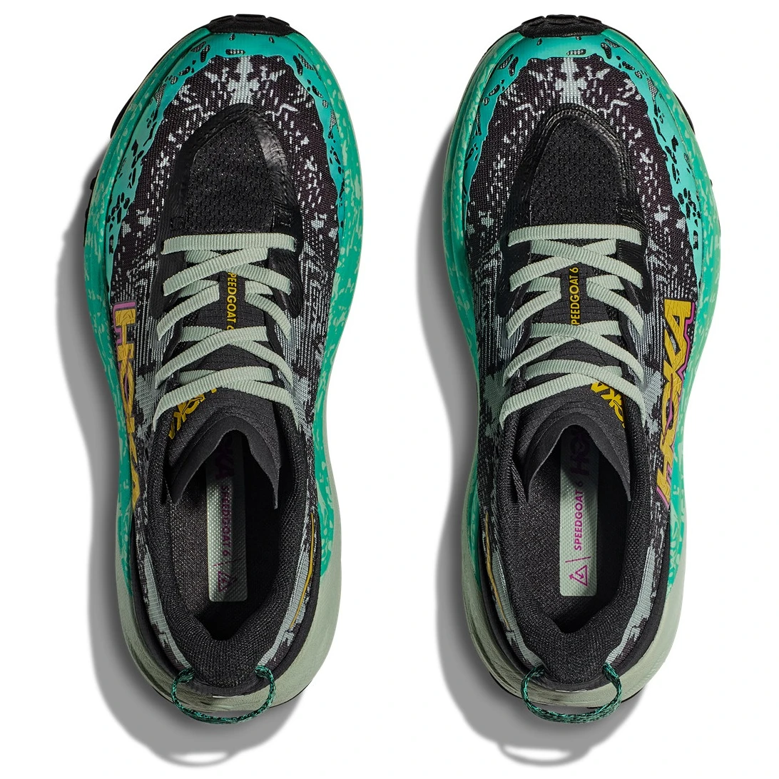 Der Speedgoat 6 Laufschuh der Marke Hoka ist für technische Trailskonzipiert. Die 6. Generation kehrt mit geringem Gewicht und großartiger Traktionzurück. Dieser Schuh verfügt von der Sohle bis zu den Schnürsenkeln über eine Vibram® Megagrip-Zwischensohle mit Traction Lug für besseren Halt auf losem Untergrund. Der Speedgoat 6 behält die gleiche Sohlenhöhe und Rockerform (Krümmung der Sohle) bei, verwendet eine leichtere Mittelsohlenmischung und ein dickeres zweilagiges Jacquard-Netz, das auf jedem Gelände Vertrauen vermittelt.