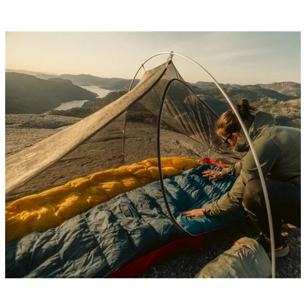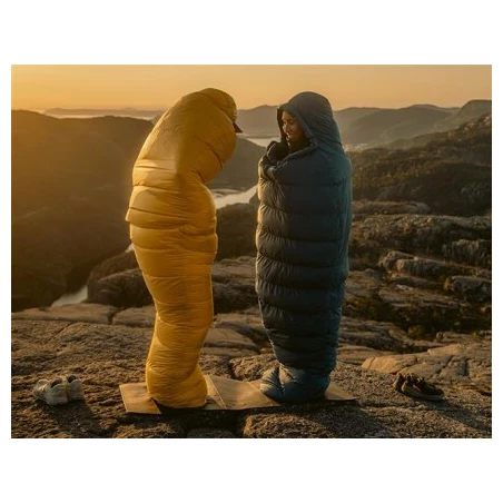 Die Füllung aus Entendaunen mit einer Füllkraft von 600 cuin und einem Mischverhältnis von 85/15 (Daunen-Feder) sorgt für eine perfekte Isolierung. Hierzu trägt auch der neu geformte Thermokragen bei, der sich eng um die Schultern legt und so Wärmeverlust verhindert. Die Kapuze hat Kordelzüge auf beiden Seiten und einen Kragen, der das Gesicht schützt. Die komfortable 3D-Mumienform verbessert die Wärmedämmung und sorgt für angenehmen Schlafkomfort. Der Fußbereich ist speziell in Form einer Haifischflosse gestaltet, sodass . Dadurch können die Beine nachts in einer gestreckten natürlichen Position verbleiben.