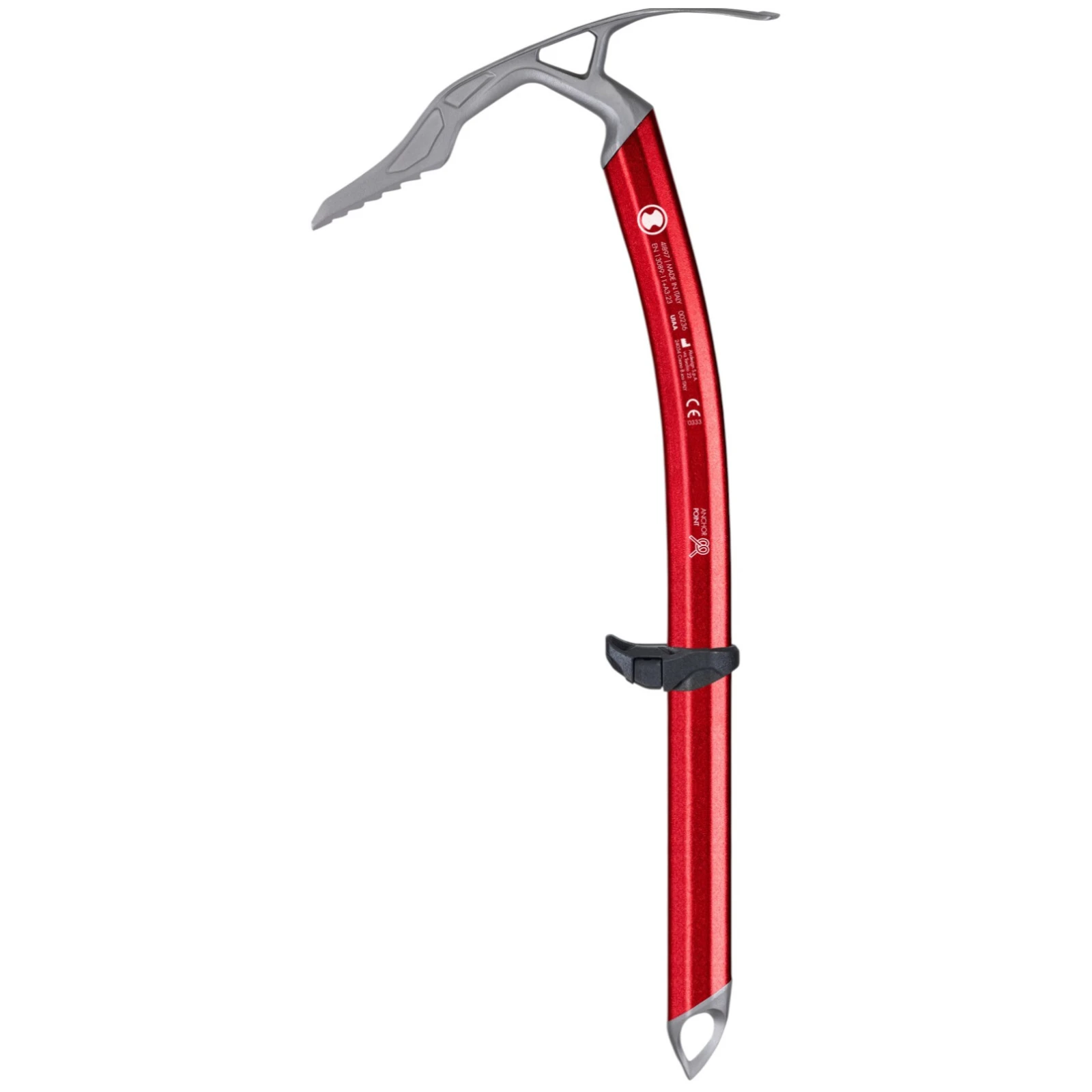 Der Eispickel ist in zwei Längen erhältlich und bietet dank der Kombination von Materialien und moderner Konstruktion eine hohe Verschleißfestigkeit bei geringem Gewicht. Praktische Details wie die Karabineröffnung oder die Markierungen für die richtige Sicherung erhöhen seine Vielseitigkeit im Gelände.
