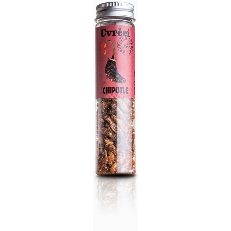 Zutaten: Grillen (Acheta domesticus) (84 %), kaltgepresstes Bio-Sonnenblumenöl, Chipotle (3 %) (100 % geräucherte Jalapeño-Paprika), Salz, Paprika, Chili, Zwiebel, Knoblauch, Kreuzkümmel, schwarzer Pfeffer, Piment, Muskatnuss, Oregano.