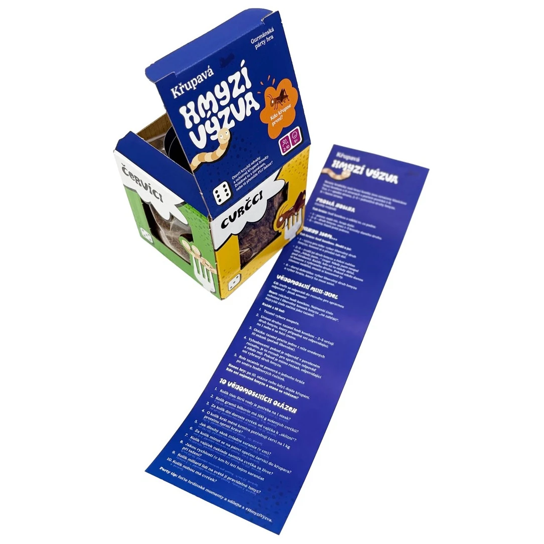 Im Inneren findest du einen Würfel mit 3 einfachen Spielen und 4 Gourmet-Geschmacksrichtungen: Würmer mit Knoblauch und Kräutern, Grillen mit Chili und Limette, Heuschrecken mit Parmesan und Maden mit Speckgeschmack. Öffne den Beutel, würfle und probiere.