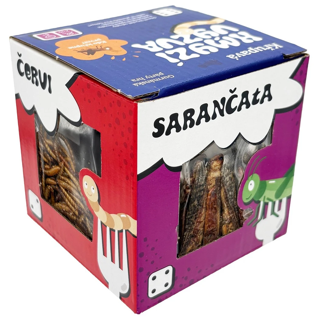 Lustiges Partyspiel mit essbaren Insekten von Sens. Würfeln, Spaß haben und Würmer, Grillen, Heuschrecken und Larven probieren. Ideal als lustiges Geschenk.