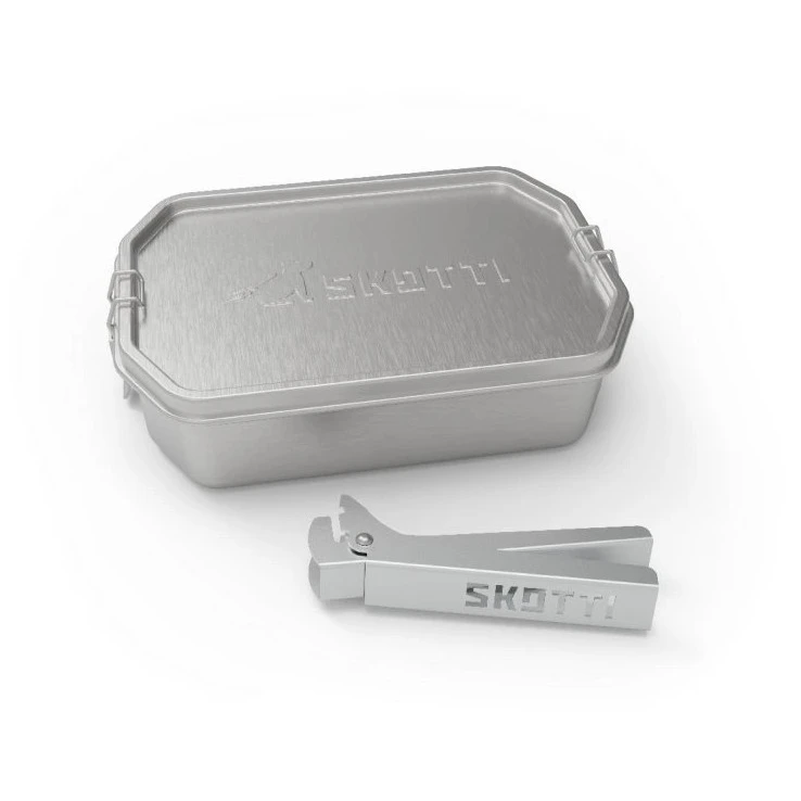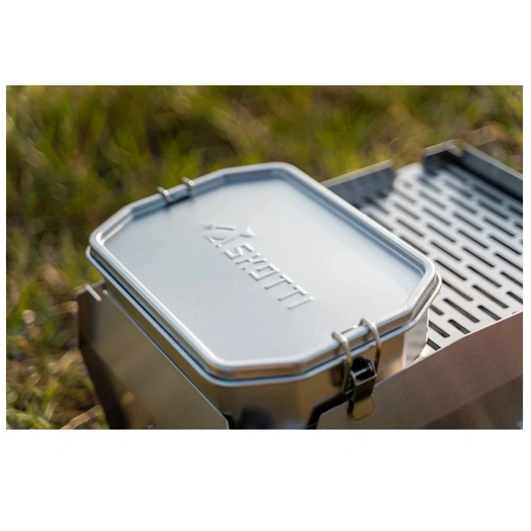 Der SKOTTI 1L Essensbehälter ist ein multifunktionaler Edelstahlbehälter, der die Möglichkeiten des SKOTTI Klappgrills erweitert und gleichzeitig als robuste Essensbox dient. Dank der robusten Aluminiumzange kann die Box sicher gegriffen und direkt auf dem Grill als kleiner Topf oder Pfanne verwendet werden, was sich zum Beispiel zum Erwärmen von Soßen, Kochen von Nudeln oder Anbraten von Gemüse eignet. Der Boden der Box nimmt genau die Hälfte des Rostes ein, sodass Sie gleichzeitig kochen und auf der anderen Hälfte weiteres Essen grillen können.
