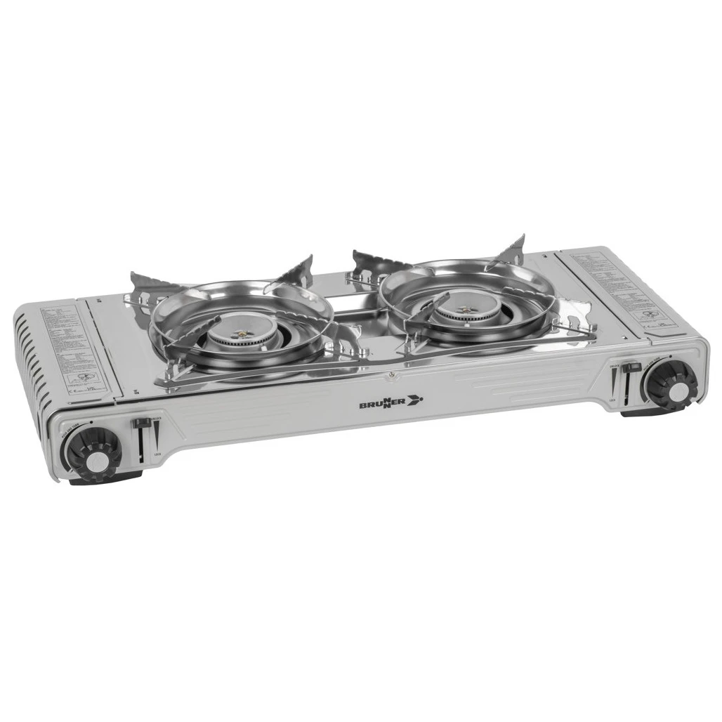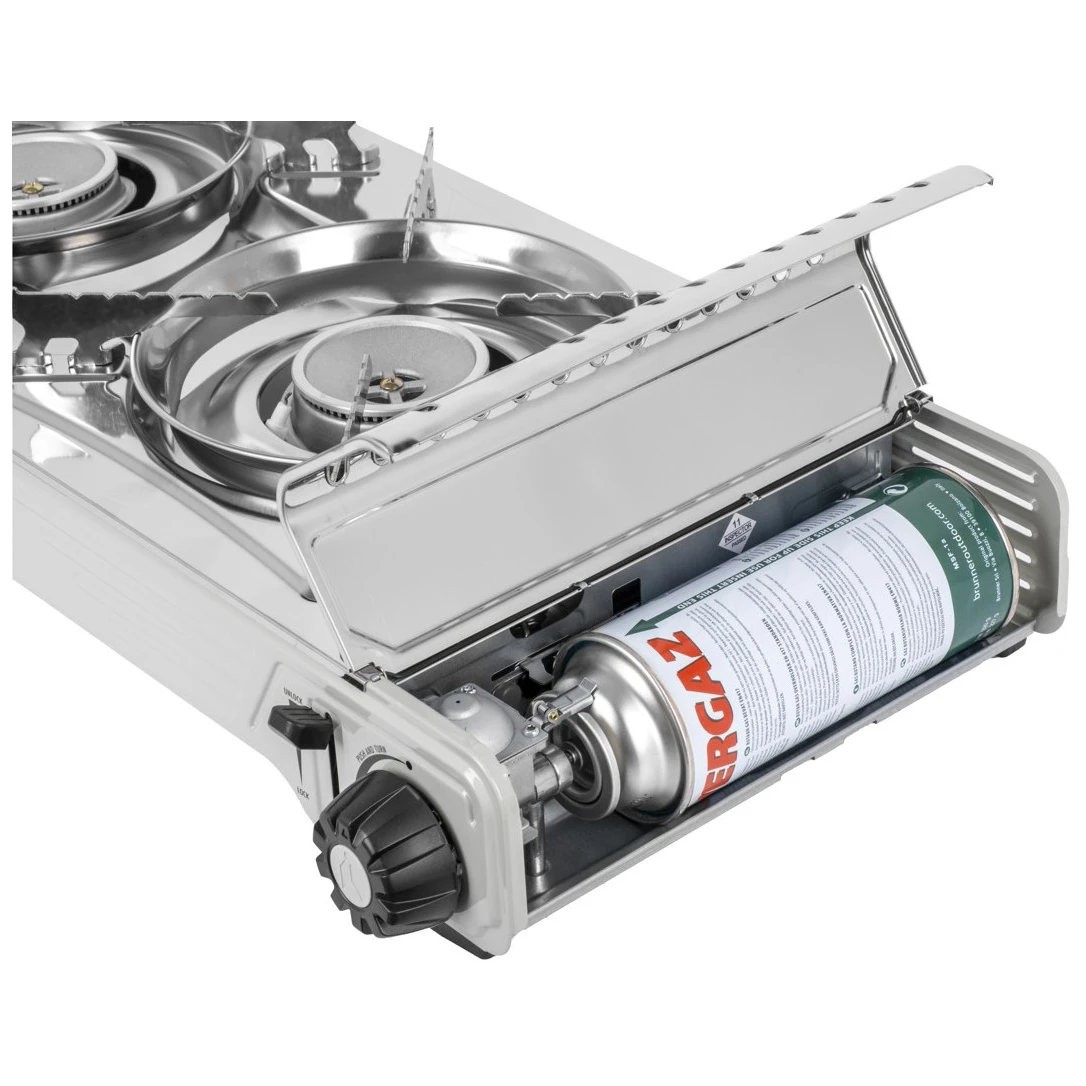 Der Gaskocher mit 2 Brennern und Grillplatte Devil Double Grill von Brunner, ideal zum Kochen und einfach zu transportieren. Im Lieferumfang enthalten sind ein Edelstahl-Rost für die stabile Platzierung von Töpfen und Pfannen sowie eine Grillplatte aus Aluminiumdruckguss mit glatter, gerippter Antihaftoberfläche.