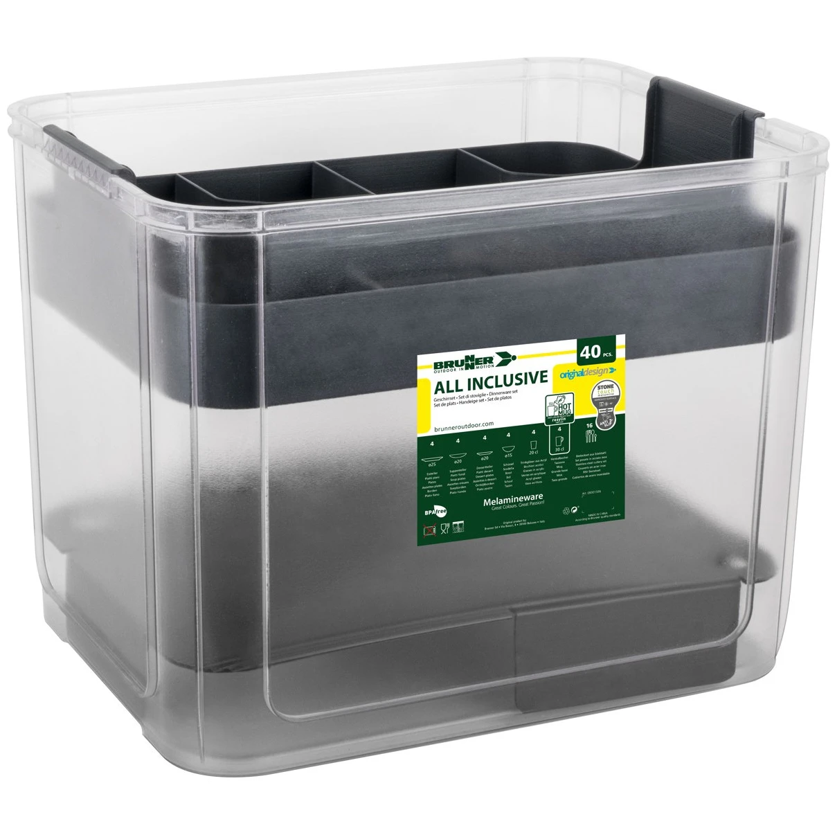 Das All Inclusive VIP Granada Brunner Geschirrset beinhaltet insgesamt 40 Teile, die aus einer Kombination von Melamin und Mineralstaub für Bruchfestigkeit gefertigt sind, zusätzlich mit rutschfester Gummierung.