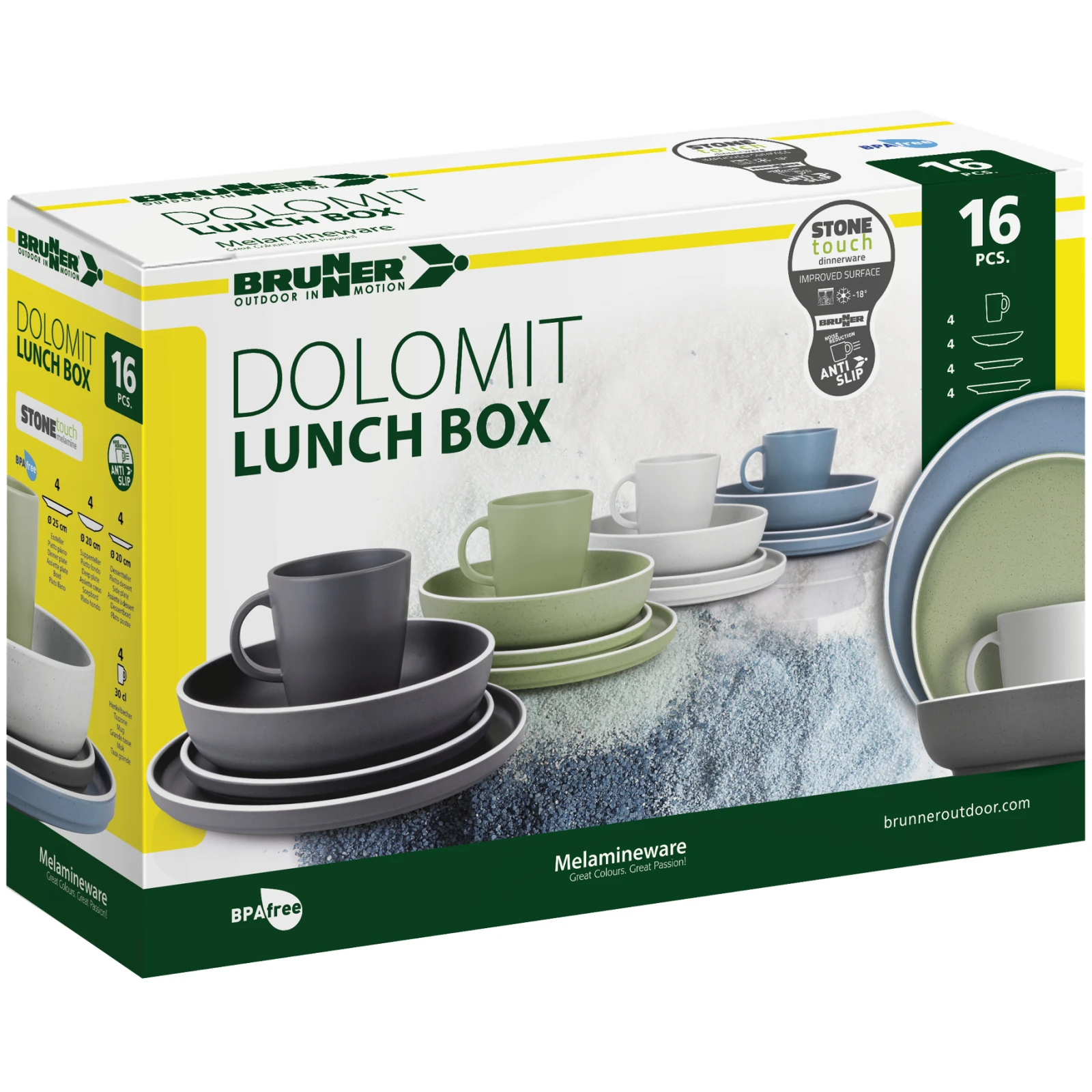 Das Dolomit Lunch Box Kochgeschirr-Set der Marke Brunner beinhaltet eine Camping-Grundausstattung. Das Set besteht aus 16 Tafelteilen und ist für 4 Personen geeignet. Beim Camping werden Sie die erhöhte Haltbarkeit dank Melaminsicherlich zu schätzen wissen. Dieses Material ist schlagfest, leicht zu reinigen, hitze- und feuchtigkeitsbeständig, geruchs- und geschmacksneutral sowie umweltfreundlich. Geschirr kann in den Gefrierschrank und die Spülmaschine gestellt werden.