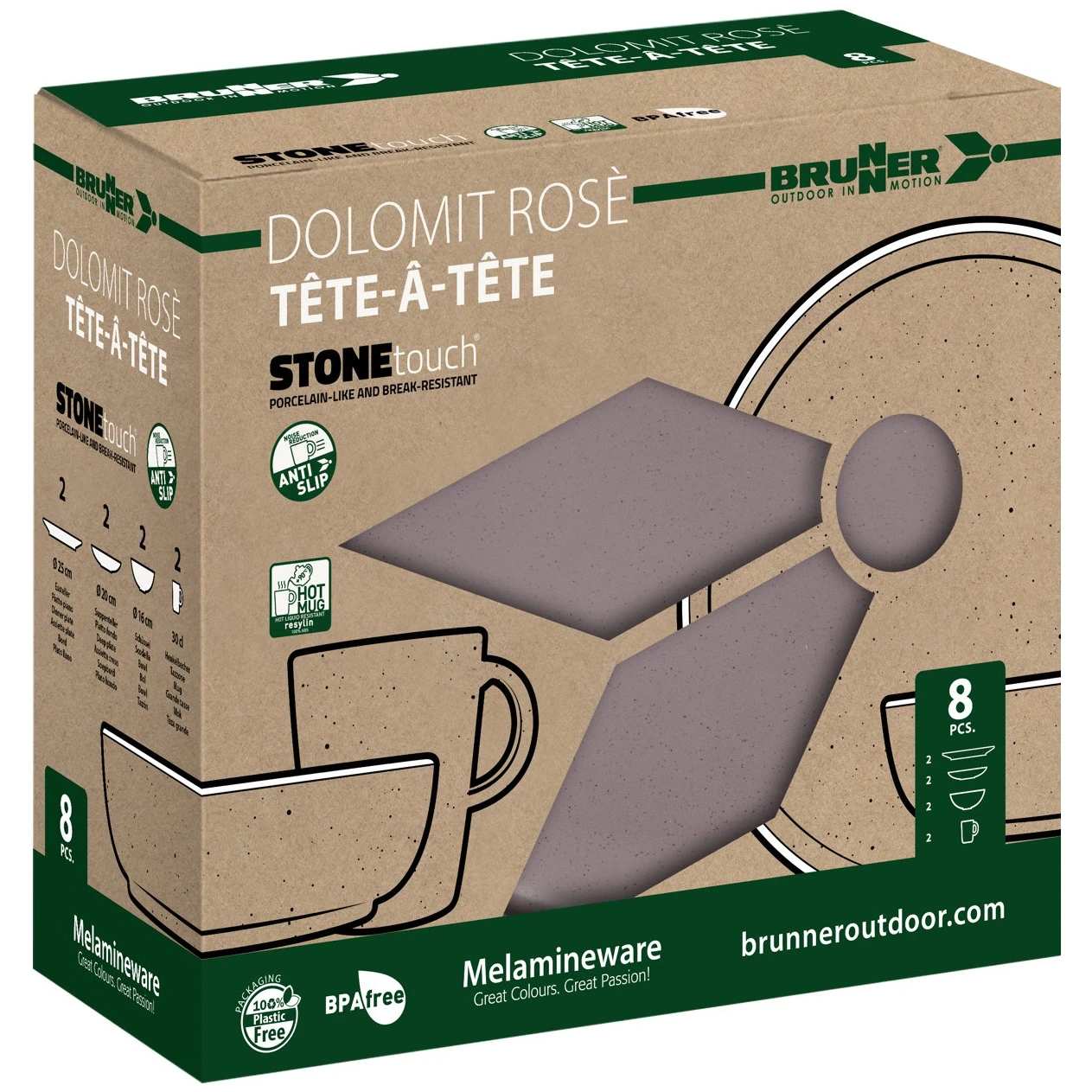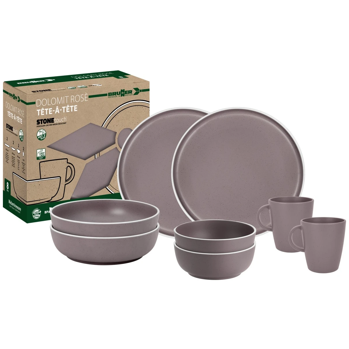 Das Dolomit Set tete-a-tete der Marke Brunner ist ein äußerst langlebiges und formschönes Geschirr-Set, das mit einem Anti-Rutsch-Ring an der Unterseite ausgestattet ist.