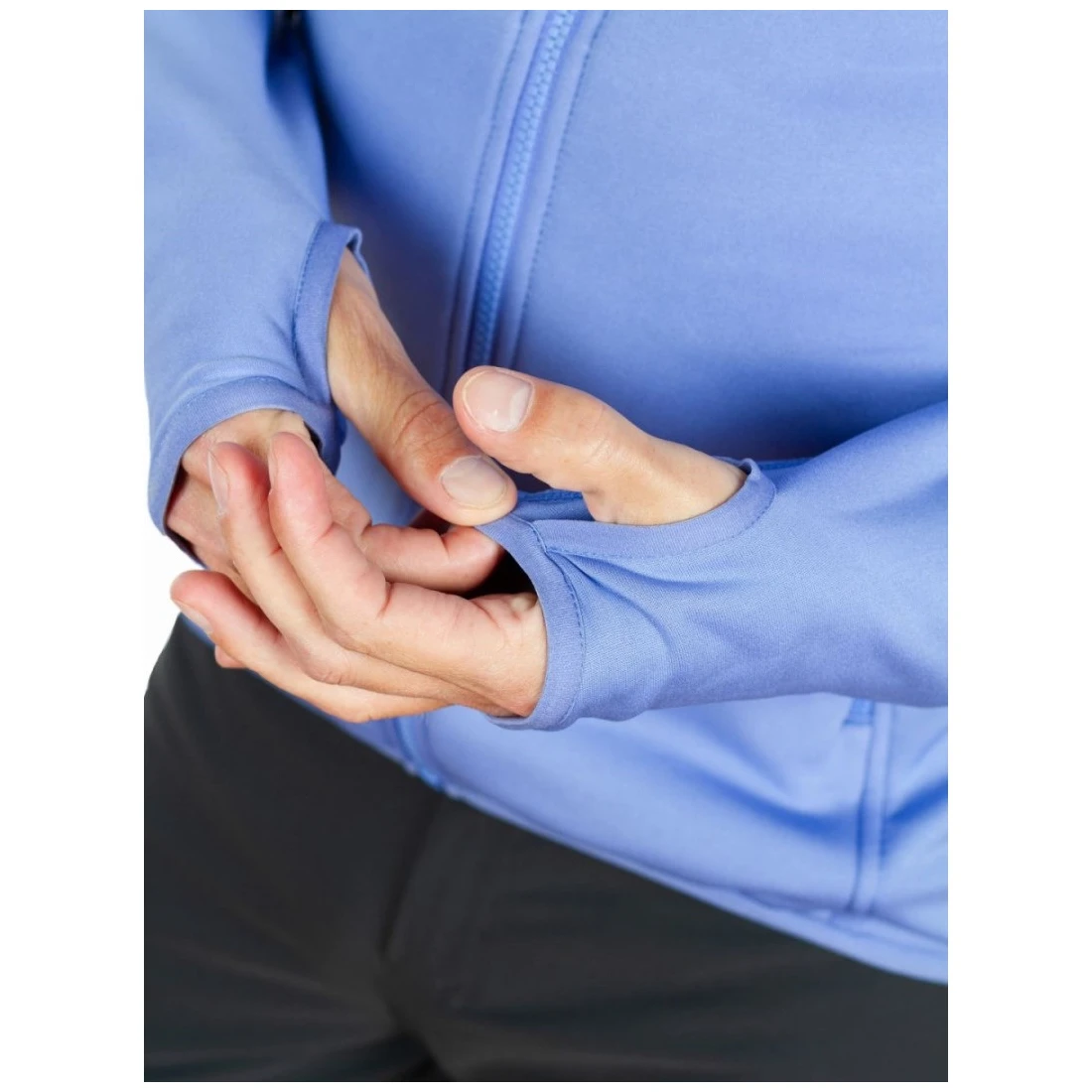 Die Ärmel sind zusätzlich mit einem elastischen Besatz und einer Daumenschlaufe versehen.