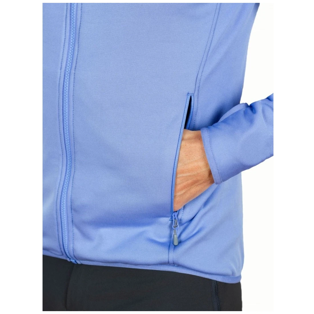 Das Material hat auf der Rückseite gebürstetes Polyester, das sich auch am nackten Körper angenehm anfühlt und für den Feuchtigkeitstransport sorgt