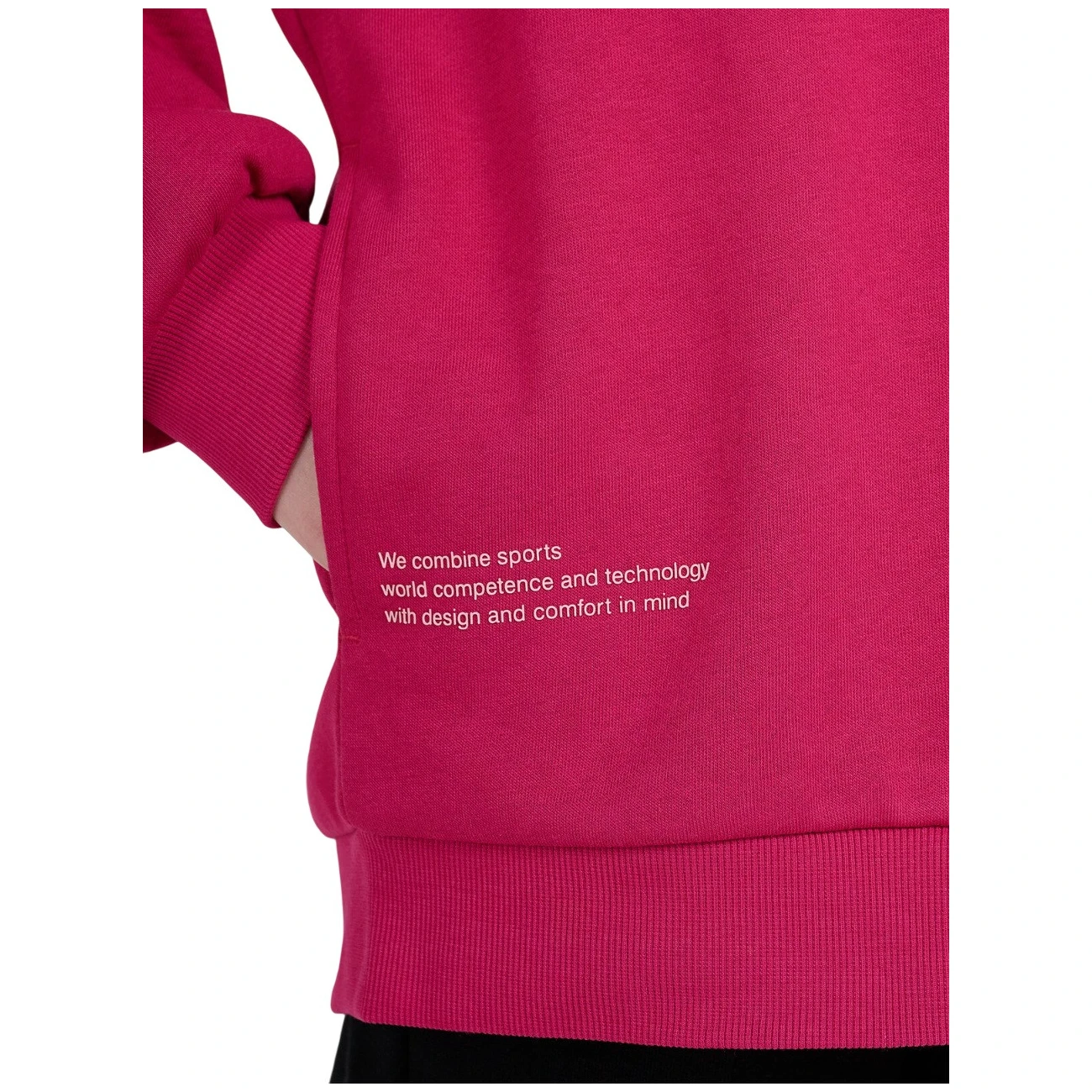 Die einseitig gerauhte Innenseite bietet zusätzliche Isolierung und ein weiches Gefühl. Das Modell hat eine integrierte Kapuze, Bündchen und einen Saum mit Gummizug für eine bessere Anpassung und eine untere Länge bis zur Hüfte. Es lässt sich einfach über den Kopf ziehen, während der Aufdruck auf der Vorderseite dem sportlichen Charakter ein markantes optisches Element verleiht.