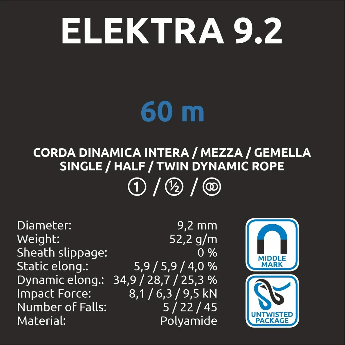Elektra 9.2 - 60m von Camp ist ein sehr leichtes Seil mit einem Durchmesser von 9.2. Tintenmarkierungen zeigen die Mitte des Seils für einfachere Handhabung und sichere Abfahrten an. Die Kombination aus reibungsloser Handhabung und guter dynamischer Dehnung macht das Seil zum idealen Partner für Mehrseillängenrouten.