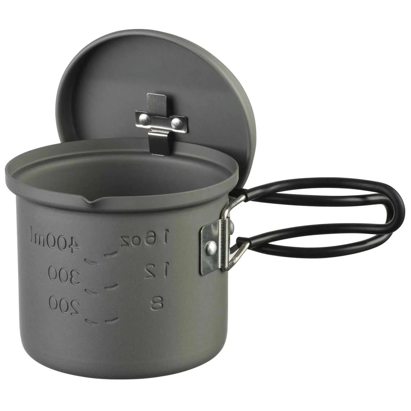 Der Aluminiumtopf mit 0,625 l Fassungsvermögen ist hitzebeständig und verfügt über einen klappbaren Edelstahlgriff mit Silikonbeschichtung, der für einen bequemen Halt sorgt.
