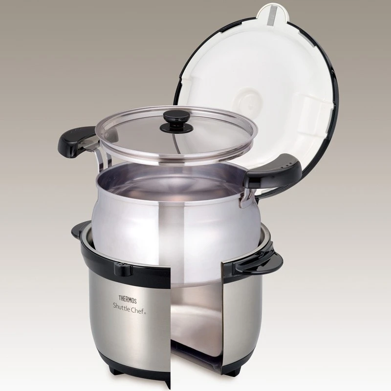 Thermos Shuttle Chef ist ein vakuumisolierter Kochtopf, der für sparsames, gesundes und bequemes Kochen ohne ständige Aufsicht entwickelt wurde. Es wurde bereits 1989 in Japan eingeführt und hat seitdem große Beliebtheit bei Outdoor-Enthusiasten für die einfache Zubereitung von Speisen in Hütten, auf Campingplätzen oder bei Familienfeiern im Garten gewonnen. Es eignet sich auch hervorragend zum normalen Kochen zu Hause. Sein Prinzip besteht darin, das Gericht auf einem normalen Kochfeld kurz zu erhitzen und anschließend durch Beibehaltung der eigenen Temperatur im isolierten Behälter, ohne weitere Energiezufuhr, fertig zu garen.