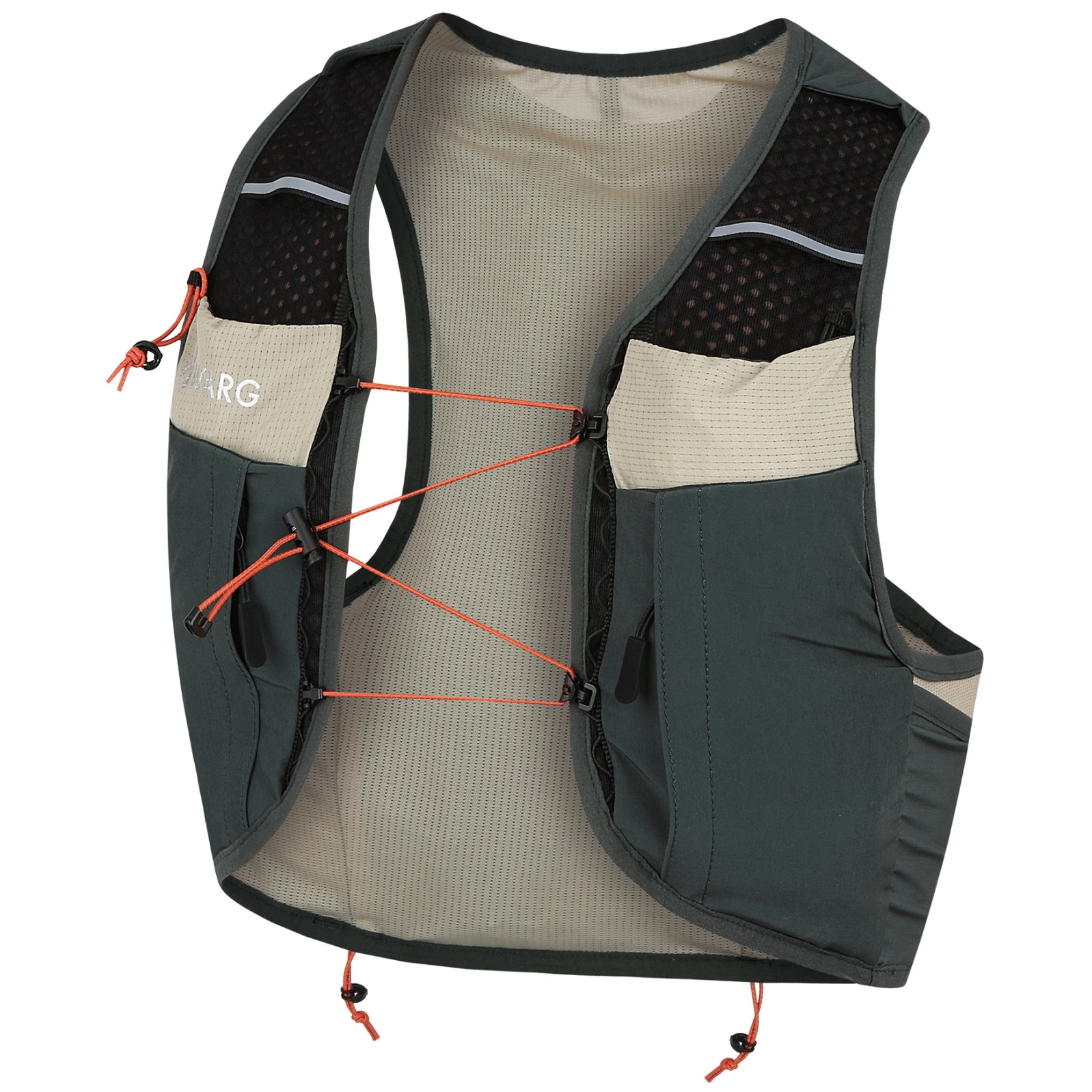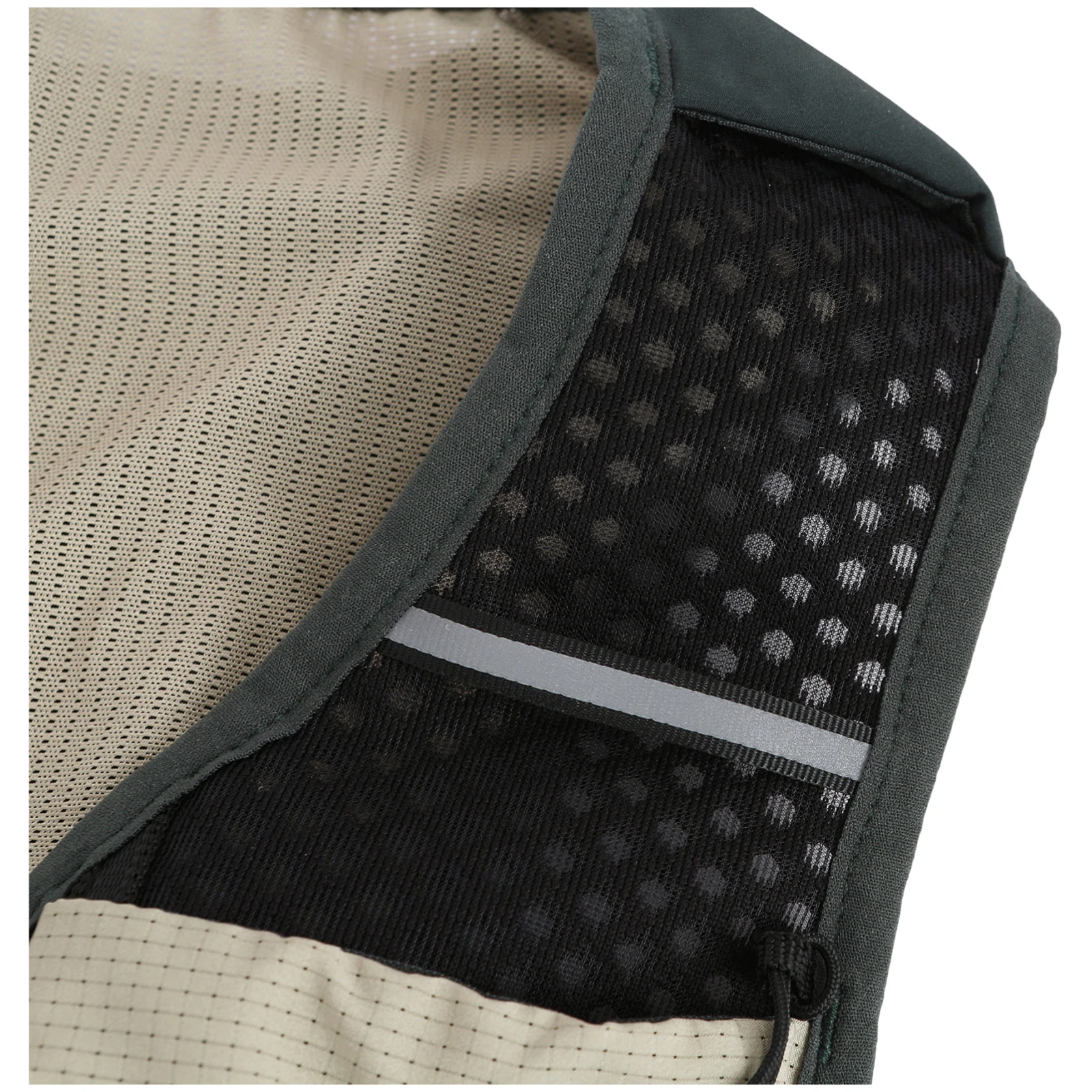 Die Weste ist aus atmungsaktivem Mesh-Material gefertigt, das auch bei intensiver Belastung für gute Belüftung und Komfort sorgt. Die verstellbaren Brustgurte, die sich an die Körpergröße und die Menge der getragenen Ausrüstung anpassen, sorgen für einen stabilen Sitz am Körper. Auf der Rückseite befinden sich eine Reißverschlusstasche und eine Klettverschlusstasche, ergänzt durch Gummizüge, die zur Fixierung von Ausrüstung (z.B. Jacke) oder zum Zusammenziehen des Tascheninhalts verwendet werden können. Es gibt auch Platz für einen Trinkblasenbehälter, der eine bequeme Flüssigkeitszufuhr während des Laufs ermöglicht.