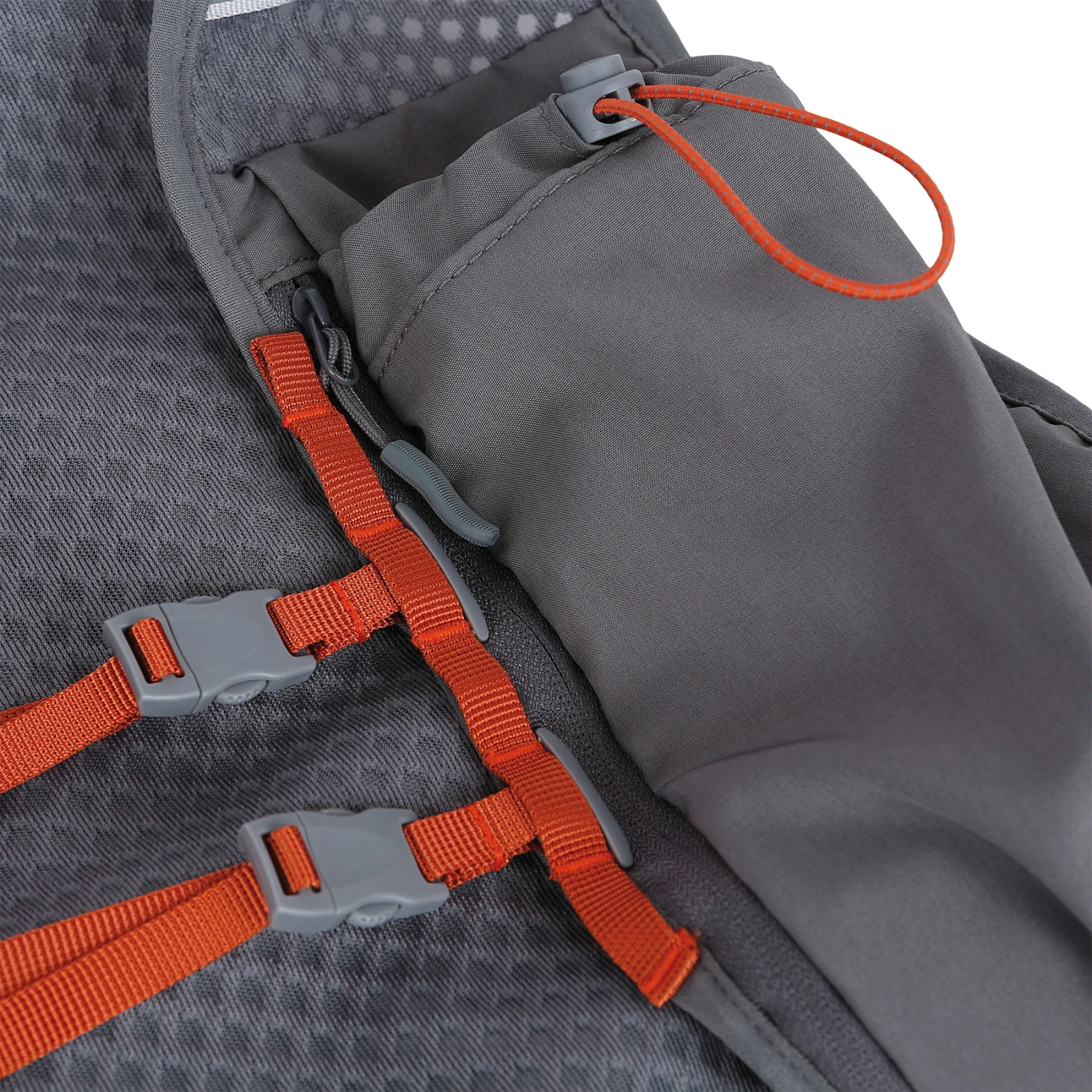 Auf der Rückseite befinden sich zwei Taschen, von denen eine mit einem Reißverschluss für die sichere Aufbewahrung von Wertsachen ausgestattet ist. Es gibt auch Platz für einen Trinkbeutel, der eine bequeme Flüssigkeitsaufnahme während des Laufs ermöglicht. Im vorderen Teil befinden sich zwei verstellbare Brusttaschen, ideal zum Beispiel für Soft Flasks oder Energieriegel, sodass alles Wichtige ohne Anhalten leicht zugänglich ist.