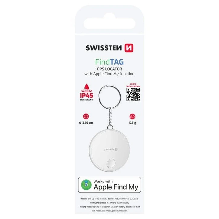 Swissten Find Tag ist ein kompakter Smart Locator, der Ihnen hilft, verlorene Schlüssel, Geldbörsen, Taschen oder andere Wertsachen schnell wiederzufinden. Dank der Integration in das Apple Find My-Netzwerk funktioniert er direkt mit Ihrem iPhone und iPad, ohne dass zusätzliche Apps installiert werden müssen. Der eingebaute Summer und die präzise Ortung sorgen dafür, dass Sie Ihre Sachen immer leicht finden, auch unter schwierigen Bedingungen. Das robuste Gehäuse aus ABS-Kunststoff mit IP45-Schutz und einer Akkulaufzeit von bis zu 15 Monaten machen den Find Tag zu einem zuverlässigen Begleiter für jeden Tag.
