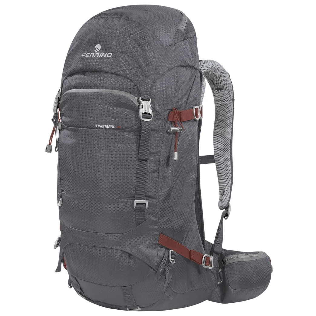 Wanderrucksack Ferrino Der Finisterre 38 verfügt über ein perfekt belüftetes DNS-Rückensystem. Der Rucksack kann über den oberen oder unteren Eingang befüllt werden, die Zwischenkammertrennwand befindet sich über dem unteren Eingang und lässt sich komplett öffnen. Das verwendete Material besteht zu 100 % aus Recyclingmaterial und ist mit einem RECCO-Reflektor ausgestattet, der eine schnelle Personensuche unter schwierigen Bedingungen ermöglicht. Der Rucksack bietet außerdem eine Vielzahl an Taschen – seitlich, vorne und im Deckel. Halterungen für Trekkingstöcke oder Eispickel sind selbstverständlich vorhanden.
