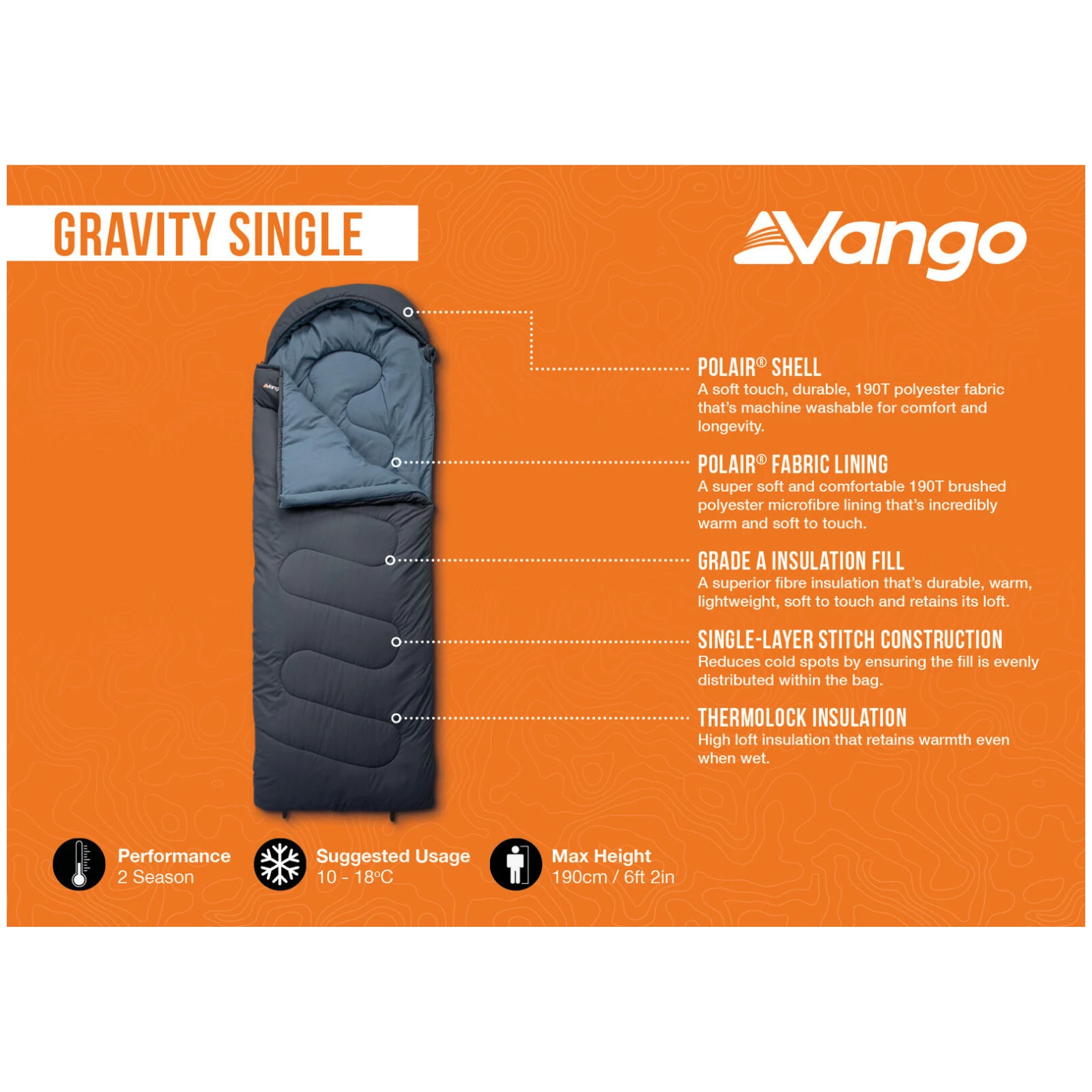 Der Schlafsack Gravity Single der Marke Vango ist für alle gedacht, die einen bequemen, warmen und erschwinglichen Schlafsack fürs Campen, Festivals oder Wochenendausflüge in die Natur suchen. Der Schlafsack ist mit einer ThermoLock-Isolierung der Klasse A ausgestattet, die zuverlässige Wärme bietet, leicht und weich ist und ihre isolierenden Eigenschaften auch in feuchter Umgebung beibehält. Einschichtige Konstruktion der Nähte sorgt für eine gleichmäßige Verteilung der Isolierung und minimiert die Entstehung von Kältebrücken.