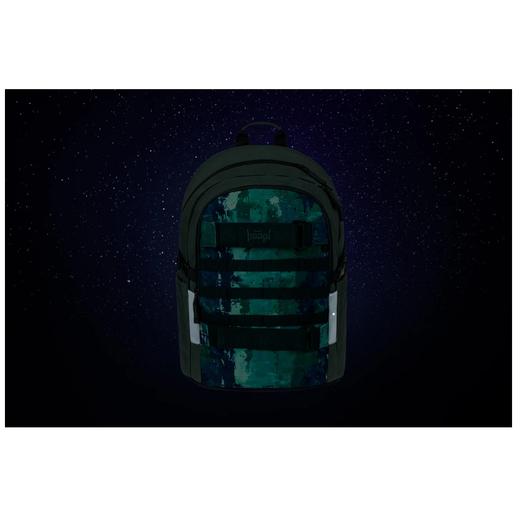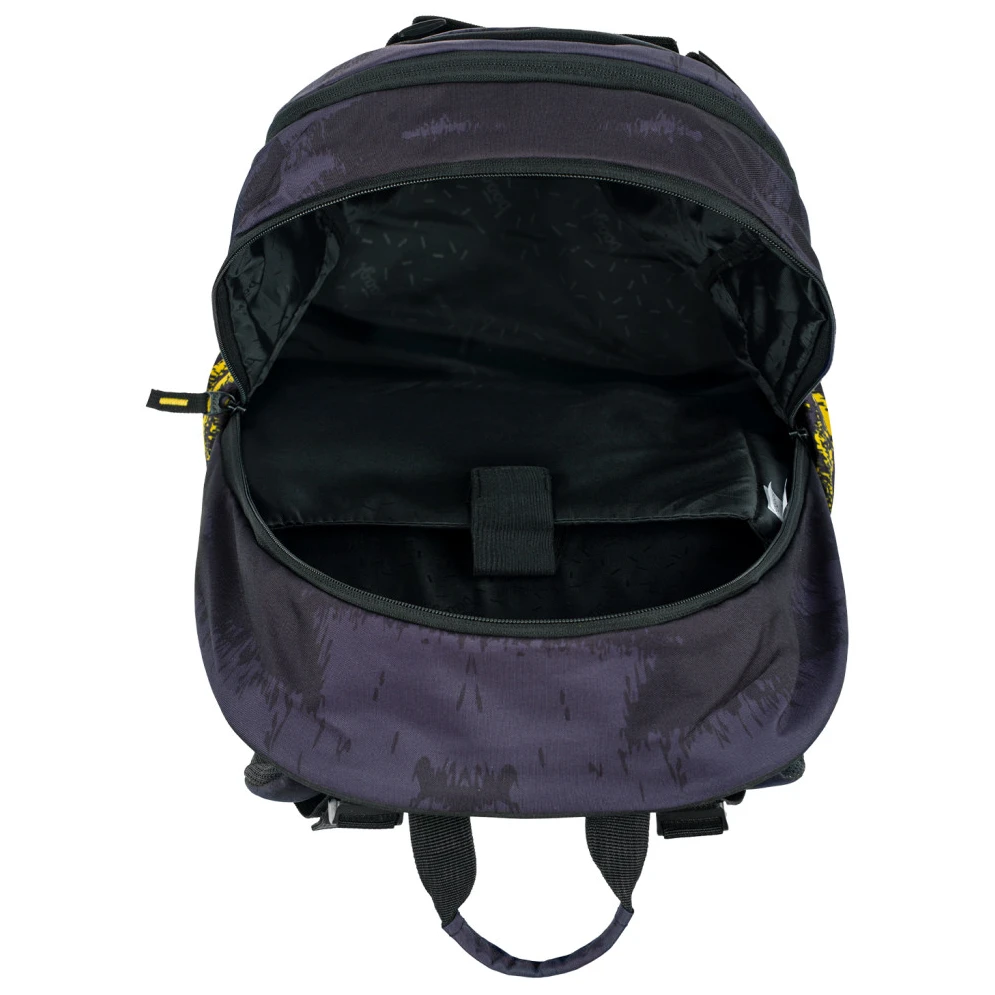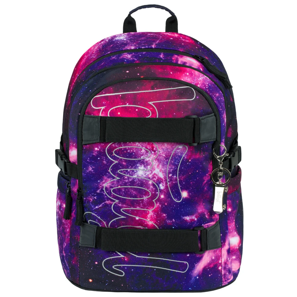 Der Rucksack ist aus robustem und wasserabweisendem Material gefertigt. Er hat drei separate Reißverschlussfächer. Im Inneren befindet sich ein praktischer Organizer und ein Fach für einen 15"-Laptop oder ein Tablet. Zwei seitliche Netztaschen sind ideal für eine Trinkflasche. An der Vorderseite befinden sich Riemen zur Befestigung eines Skateboards. Reflektierende Elemente, die auf allen Seiten angebracht sind, erhöhen die Sichtbarkeit des Kindes bei schlechten Lichtverhältnissen.