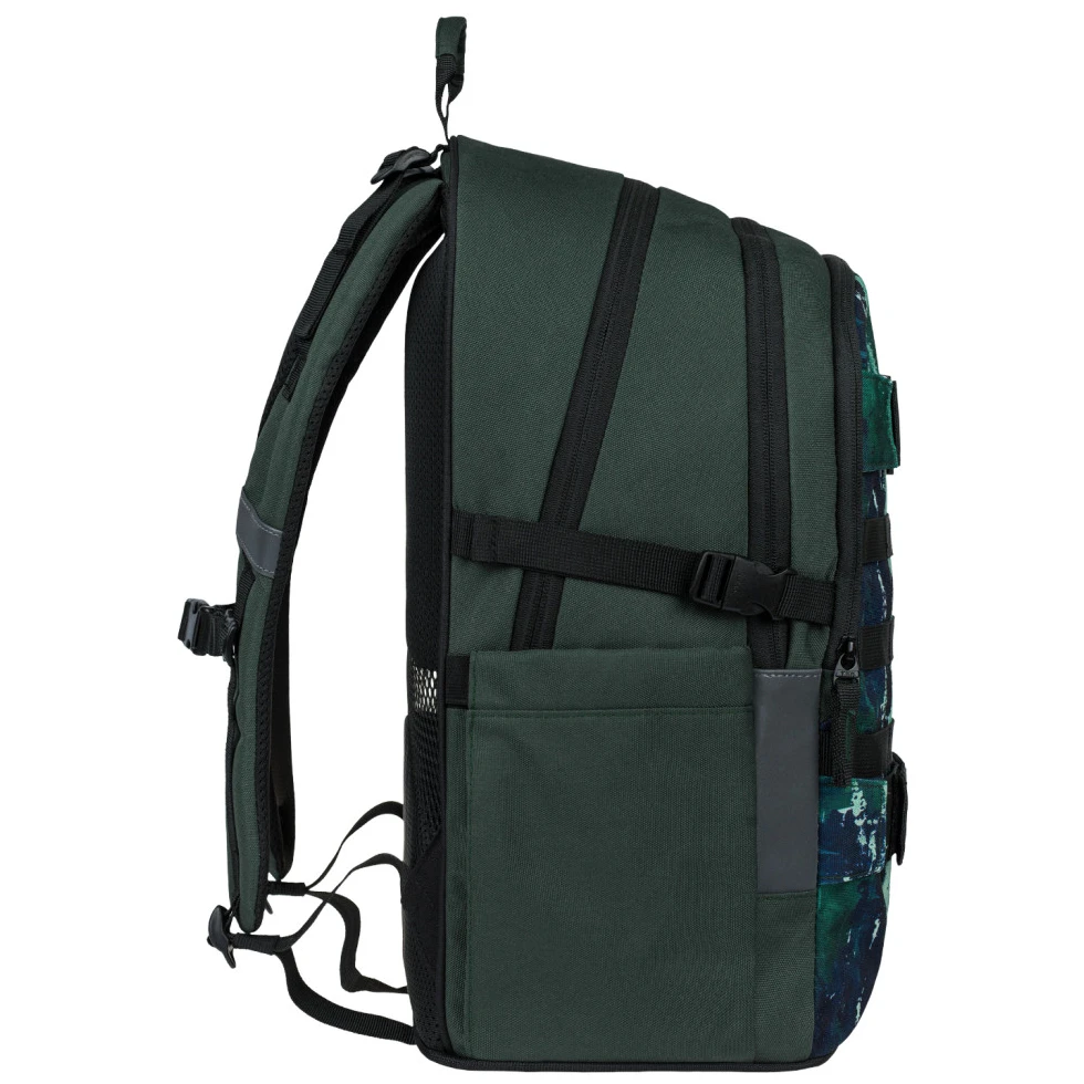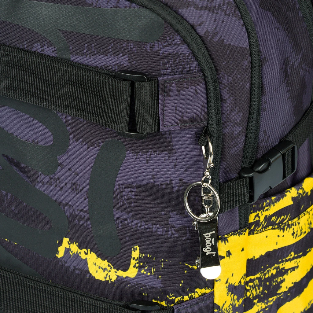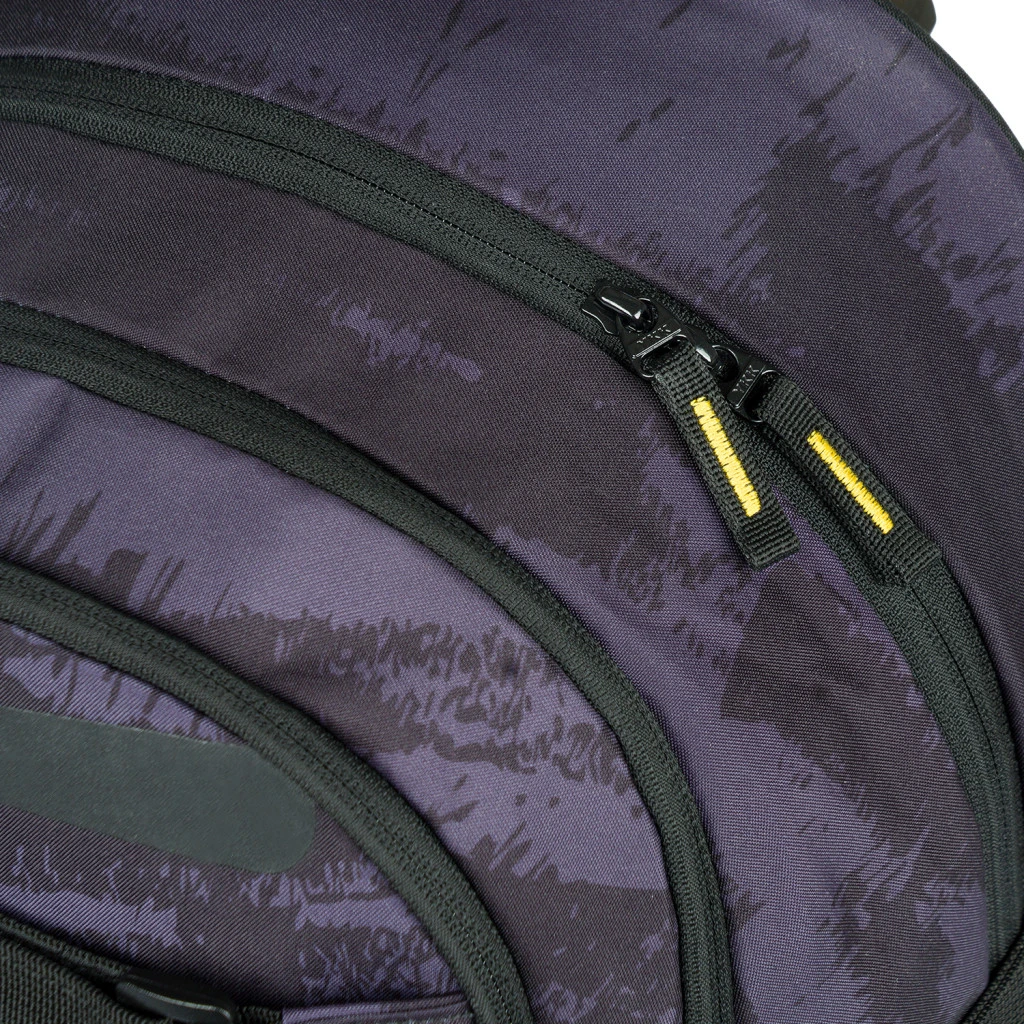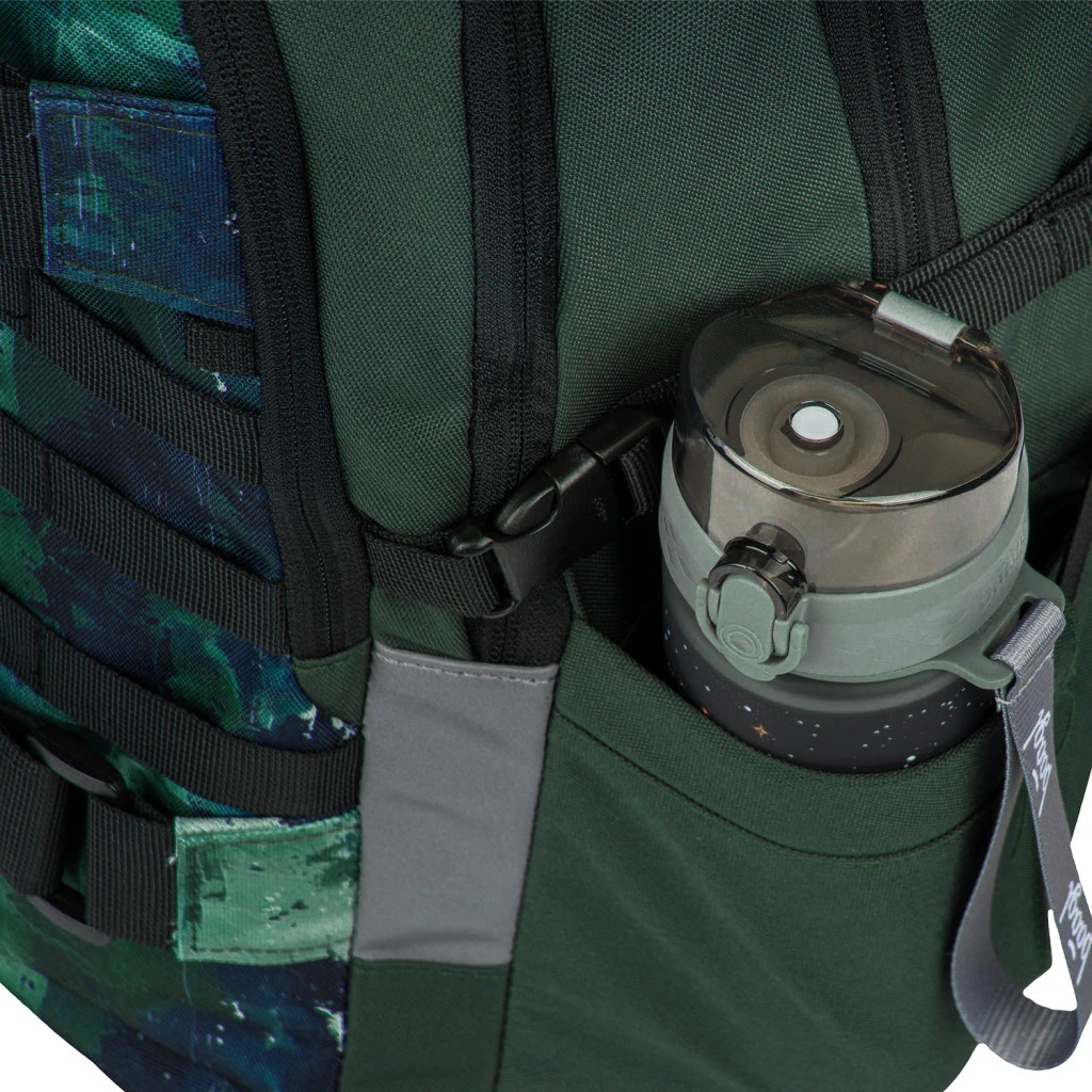 Der Rucksack ist aus robustem und wasserabweisendem Material gefertigt. Er hat drei separate Reißverschlussfächer. Im Inneren befindet sich ein praktischer Organizer und ein Fach für einen 15"-Laptop oder ein Tablet. Zwei seitliche Netztaschen sind ideal für eine Trinkflasche. An der Vorderseite befinden sich Riemen zur Befestigung eines Skateboards. Reflektierende Elemente, die auf allen Seiten angebracht sind, erhöhen die Sichtbarkeit des Kindes bei schlechten Lichtverhältnissen.