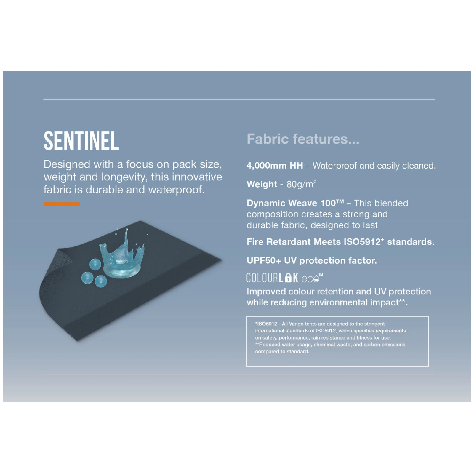 Die Sentinel Seitenmarkise von Vango besteht aus strapazierfähigem Dynamic Weave 100™ Gewebe mit einer Wassersäule von 4.000 mm HH, das sich durch ein hervorragendes Verhältnis von Festigkeit, Gewicht und kompakten Packmaßen auszeichnet. Dank der ColourLok-Technologie behält das Material langfristig seine Farbe und funktionalen Eigenschaften. Die Konstruktion besteht aus PowerFlex®-Fiberglasstangen, die leicht, robust und auch bei windigerem Wetter zuverlässig sind.