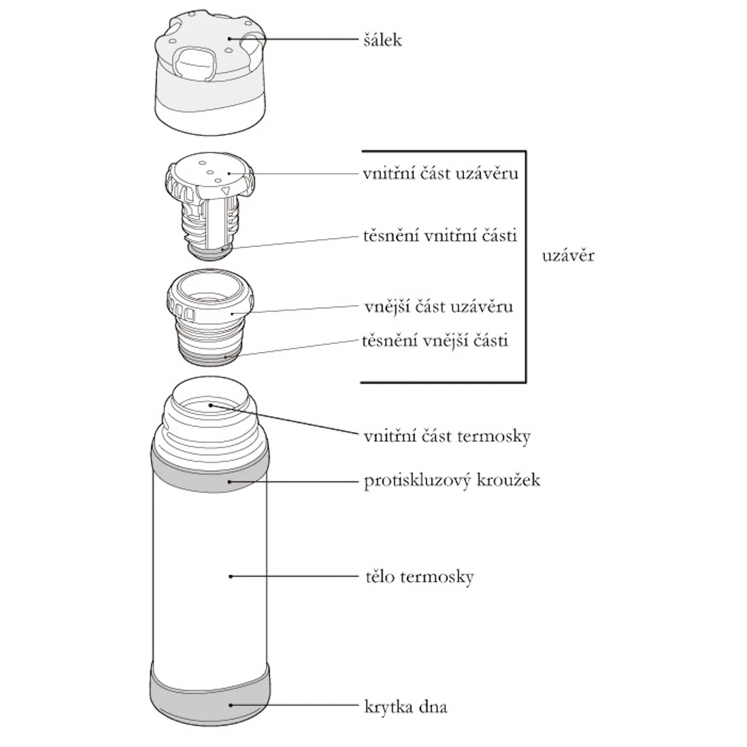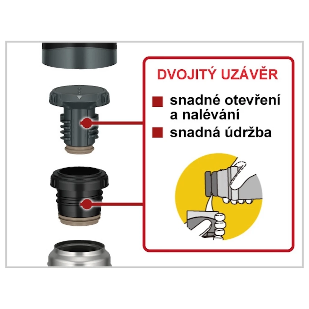 Die Besonderheit der Thermoskanne liegt in ihrem schmalen Hals mit einem Durchmesser von 36 mm mit einem speziellen Doppelverschluss, der einen gleichmäßigen Ausfluss des Getränks gewährleistet und das Öffnen und Schließen erleichtert (eine halbe Drehung genügt und Sie können ausschenken). Im Lieferumfang ist außerdem ein praktischer Lochbecher enthalten, der aus zwei Materialien unterschiedlicher Härte besteht und so ein Verrutschen beim Öffnen der Thermoskanne verhindert. Der breite Boden der Tasse sorgt für einen sicheren Stand und ermöglicht ein bequemes Greifen. Am Korpus der Thermoskanne finden wir zudem einen Anti-Rutsch-Ring, der das Öffnen auch mit dicken Handschuhen erleichtert und gleichzeitig als Schutz dient, ebenso wie ein Schutzfuß an der Unterseite.