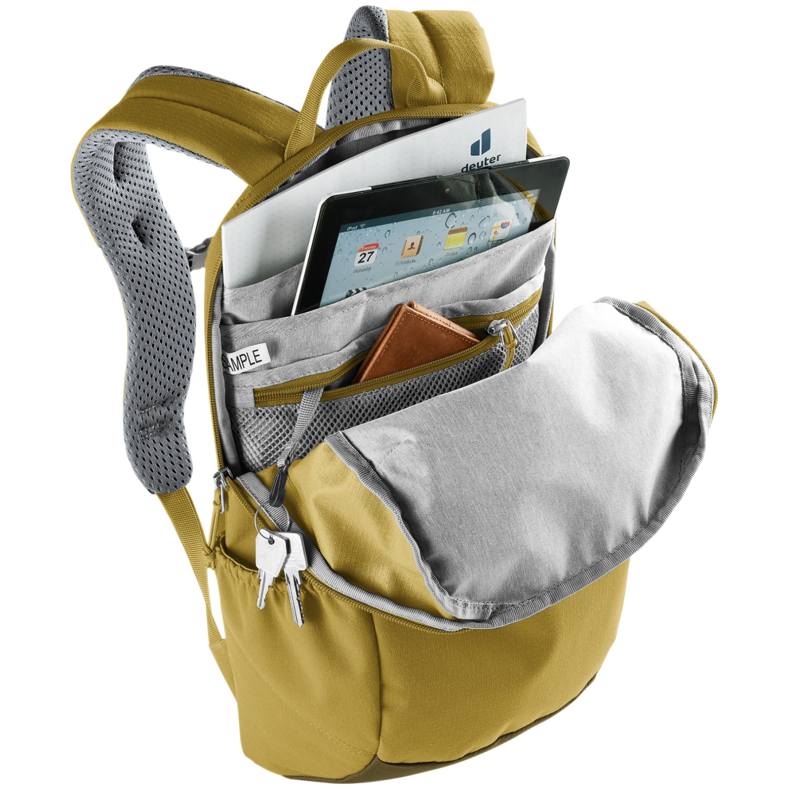 Das Hauptfach mit Rundbogen-Reißverschluss enthält ein Dokumentenfach, ein Laptopfach und eine Reißverschlusstasche mit Schlüsselclip. An den Seiten befinden sich zwei elastische Taschen für eine Getränkeflasche. Auf der Rückseite befindet sich eine für das Mobiltelefon vorgesehene Tasche , die einen einfachen Zugriff ermöglicht, ohne dass der Rucksack abgesetzt werden muss. Der seitliche Reißverschluss ermöglicht den direkten Zugriff auf das Laptopfach.