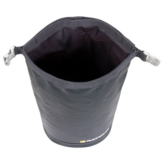 Der Reise-Futterbehälter Ruffwear Kibble Kaddie™ Dog Food Carrier mit einem Volumen von 10 Litern ist aus weichem Material gefertigt, das einen einfachen Transport ermöglicht.