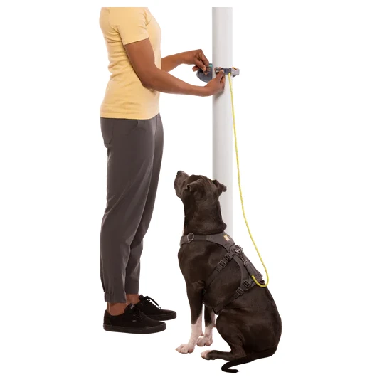 Die Basis bildet der ergonomische HitchLock™-Mechanismus, mit dem Sie die erforderliche Leinenlänge mithilfe eines Karabiners stufenlos einstellen können. Von der kürzesten bis zur Länge von 3,6 Metern. Der Karabiner fungiert als Bremssystem, wenn das Seil unter Spannung steht. Die Aufbewahrungstasche ist mit dem Rest des Seils verbunden, das Sie gerade nicht verwenden. Die Aufbewahrungstasche dient gleichzeitig als Hüftgurt oder als Befestigung an einem festen Pfosten.
