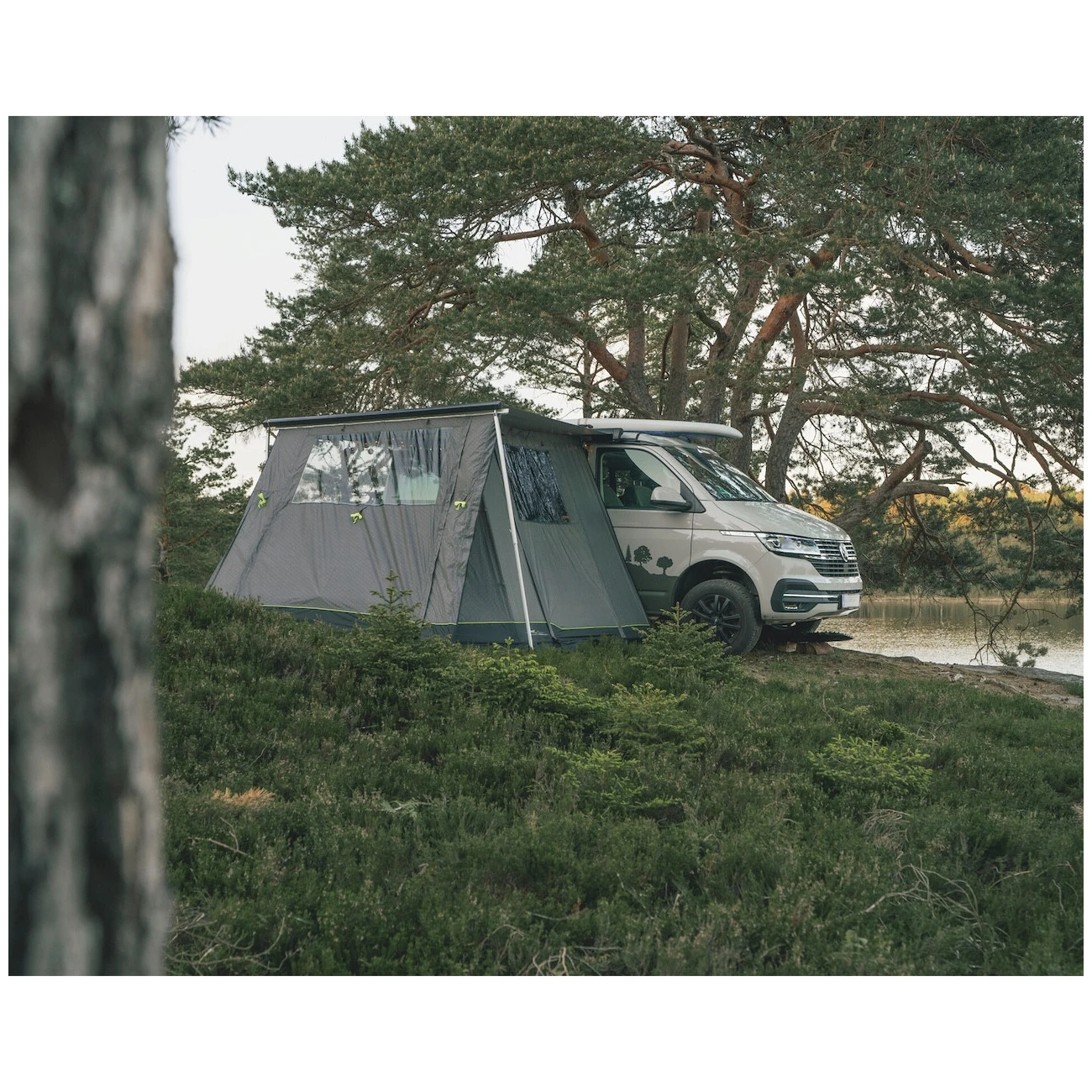 Sie befestigen das Vorzelt mit Kederleisten mit einer Breite von 5 und 7 mm direkt an der Markise. Die Außenhülle des Zeltes besteht aus dem wasserdichten Material Outtex® 4000 Select, das Sie auch bei schlechtem Wetter schützt. Seitenwände verfügen über große getönte Fenster, die den Innenraum des Vorzeltes ausreichend beleuchten und dank der Vorhänge Privatsphäre bieten. Vorbefestigte reflektierende Abspannleinen halten die Plane auch bei widrigem Wetter an Ort und Stelle. Das Vorzelt ist leicht zu verpacken und passt bequem in die hinteren Türen des VW California.