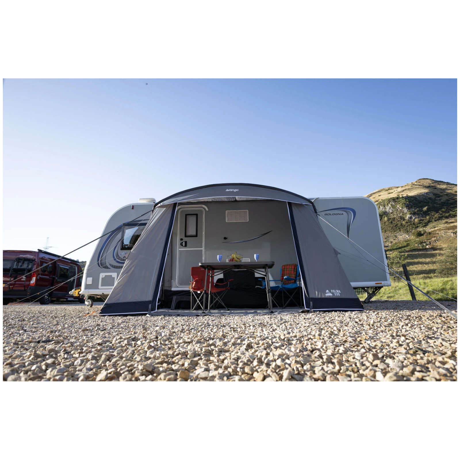 Das Vorzelt Modell Palma 330 von Vango ist ein leichtes und praktisches Touring-Vorzelt für Wohnwagen, konzipiert für Reisende, die eine zuverlässige Unterkunft für Wochenend- und kürzere Ausflüge suchen. Dank seiner kompakten Tiefe von etwa 2,4–2,5 m passt es problemlos auch auf engere Stellplätze, ohne dass auf Innenraum oder Komfort verzichtet werden muss.