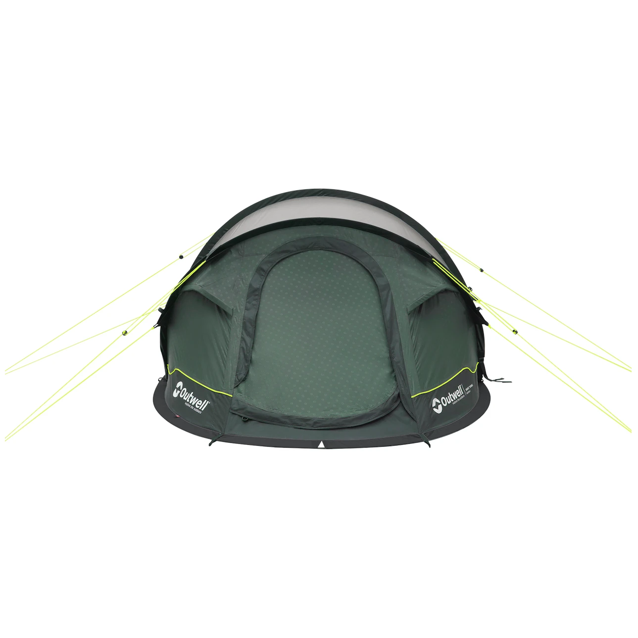 Die Zeltkonstruktion besteht aus Stangen aus festem, aber gleichzeitig flexiblem Glasfaser, das ein geringes Gewicht hat. Der Aufbau des Zeltes ist dank des selbstaufklappenden Mechanismus sehr einfach. Nach dem Auspacken schlagen Sie die Heringe ein und befestigen die Spannleinen, die entlang der gesamten Stofflänge doppelte Befestigungspunkte haben und an den Verbindungsstellen zum Zelt spezielle Verstärkungen aufweisen. System Outwell Wind Guard 2.0 verbessert die Stabilität bei starkem Wind.