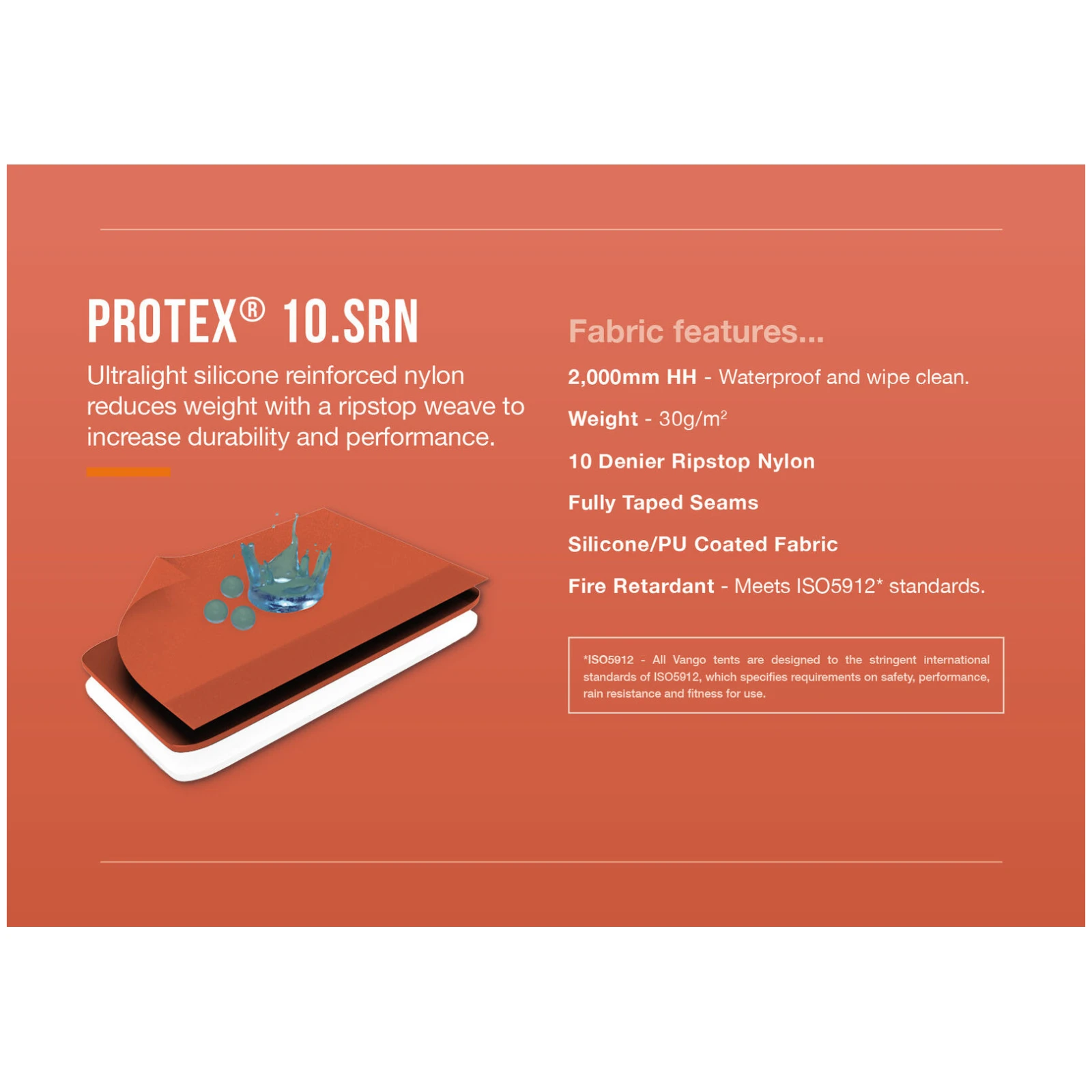 Das Außenzelt besteht aus ultraleichtem 10D Protex SRN Ripstop Nylon mit Silikon und PU Beschichtung, die eine Wassersäule von 2.000 mm gewährleistet und gleichzeitig vollständig PFC frei ist, wodurch die Umweltbelastung reduziert wird. Das Innenzelt kombiniert leichtes Ripstop-Nylon mit atmungsaktivem Mesh für bessere Belüftung und zur Reduzierung von Kondensation.