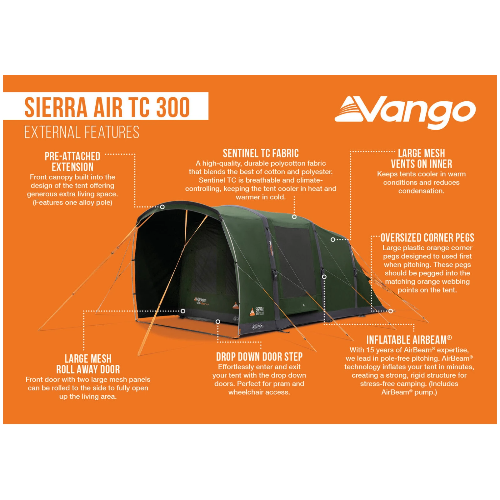 Das Vango Sierra Air TC 300 gehört zur Familienzelt Reihe von Vango und wurde für entspanntes Camping ohne Kompromisse konzipiert. Dank des hochwertigen Sentinel TC Polycotton Materials reguliert das Zelt das Innenklima auf natürliche Weise – bei Hitze bleibt es angenehm kühl, bei kälterem Wetter isoliert es besser.